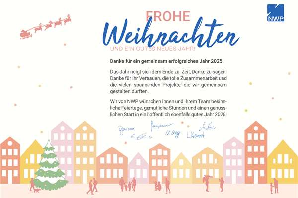 17.12.2025NWP sagt Danke und geht in die WeihnachtspauseDanke für ein gemeinsam erfolgreiches Jahr 2025!In der Zeit vom 24. Dezember 2025 bis zum 02. Januar 2026 bleibt unser Büro geschlossen. Ab dem 05. Januar 2026 sind wir wieder am Start!Wir wünschen Ihnen besinnliche Feiertage, gemütliche Stunden und einen guten Start in ein hoffentlich ebenfalls gutes Jahr 2026!